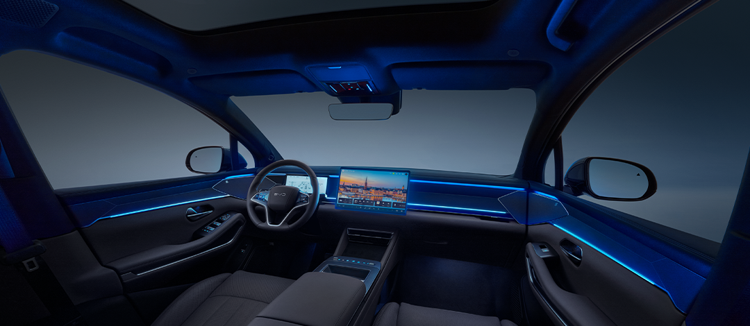 Com linhas limpas e acabamento refinado, a cortina elétrica do teto panorâmico de 2,39 m² integra-se perfeitamente ao design interno, reforçando o estilo sofisticado e moderno do veículo.